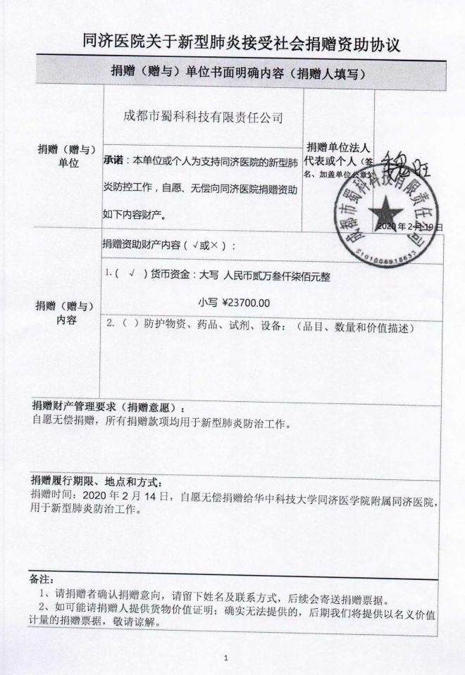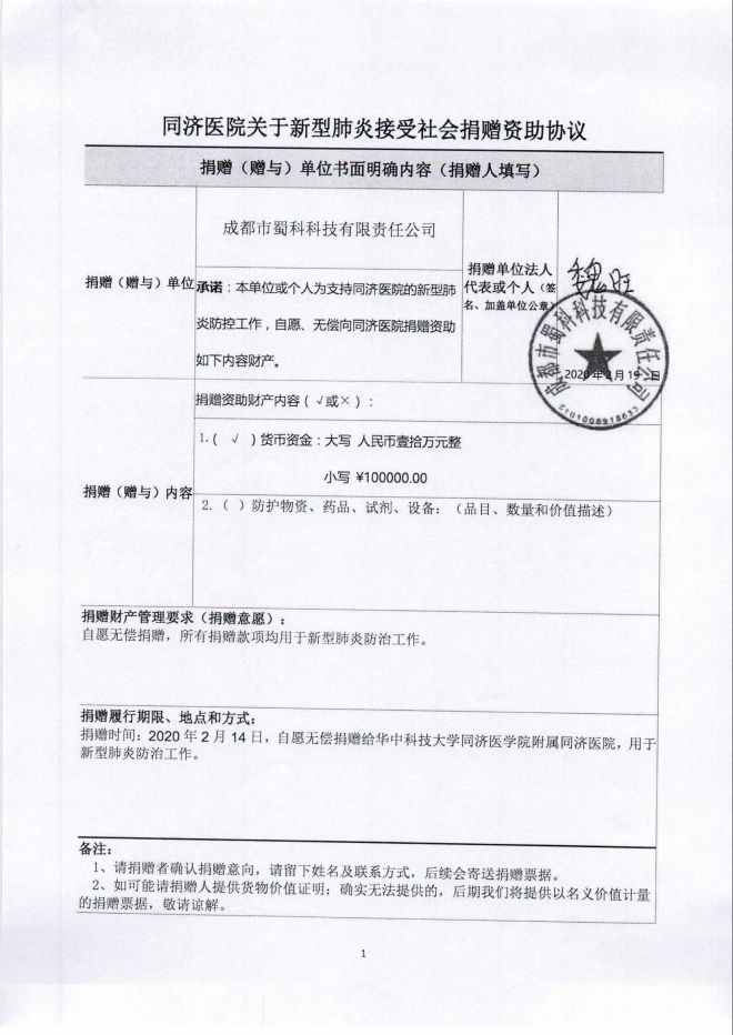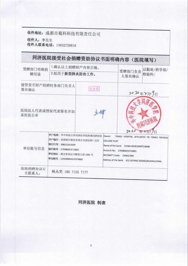 2月14日經公司定向捐贈給華中科技大學同濟醫院院附屬同濟醫院的公司捐款和公司員工的個人捐款已經全部由同濟醫院接收,將全部用于支持新冠肺炎疫情防控工作。